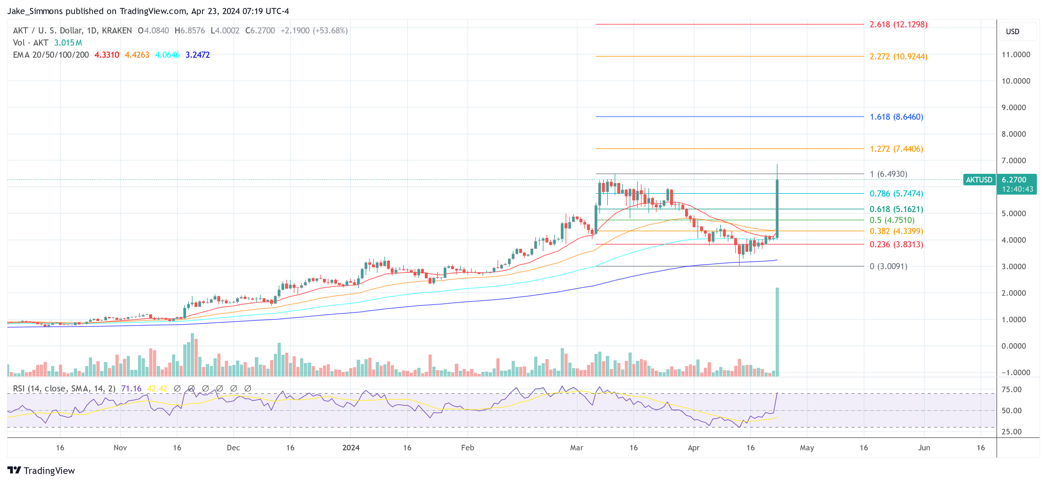 If AKT doesn’t maintain its recent gains and falls below $6.48, there is a possibility of a correction towards the $5.74 area (which represents a 0.786 Fibonacci retracement). This decline might offer attractive purchasing chances. A more significant drop could lead to retesting the $5.16 (representing a 0.618 Fibonacci retracement) and $4.75 (symbolizing a 0.5 Fibonacci retracement) support levels.