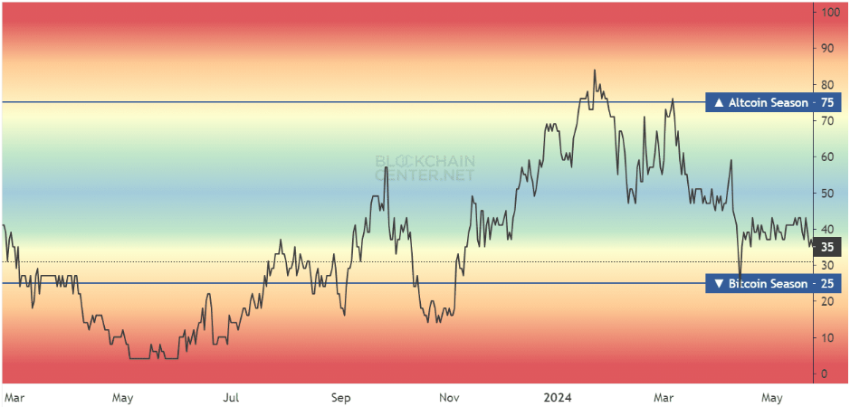 As a researcher studying market sentiment towards altcoins, I’ve been closely monitoring the Altcoin Season Index. Currently, this metric stands at a relatively low 35. In comparison, readings as high as 80 were recorded only six months ago. This significant decrease indicates that altcoins have yet to fully benefit from the potential surge in Bitcoin’s value.