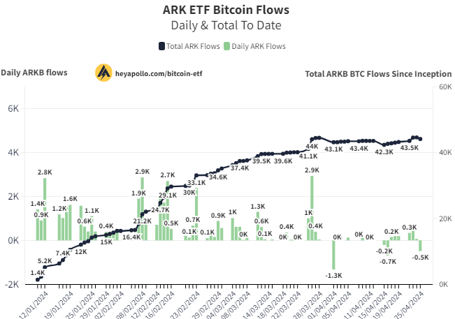 Recently, a significant amount of Bitcoin has been withdrawn from the ARK Investment Management LLC’s Bitcoin ETF (ARKB), totaling approximately 490 Bitcoins, or around $31 million, on April 25th. This is the third-largest one-day withdrawal on record for this specific ETF.