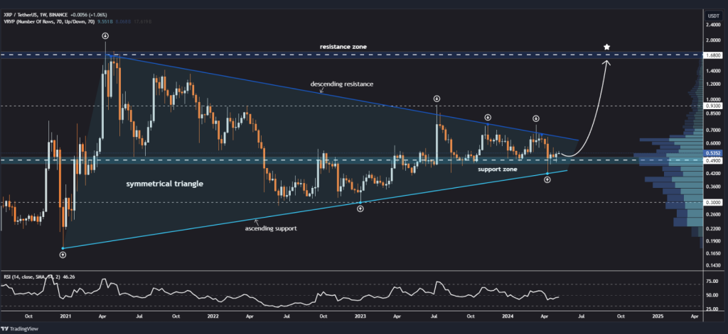 In April, when the market experienced a widespread correction, XRP touched the lower boundary of its symmetrical triangle pattern after undergoing a significant price decrease.