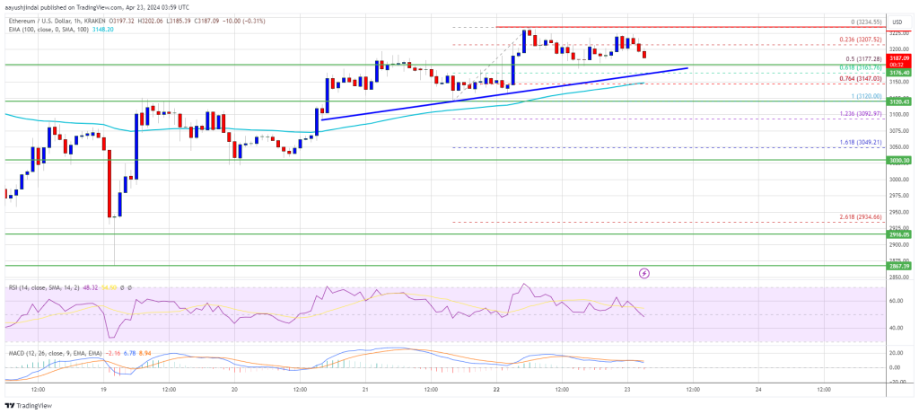 Should Ethereum be unable to surpass the $3,235 threshold, there’s a chance it may initiate a decline. A preliminary floor for Ether can be found around $3,175. The initial substantial support lies at the $3,160 region and the trendline.