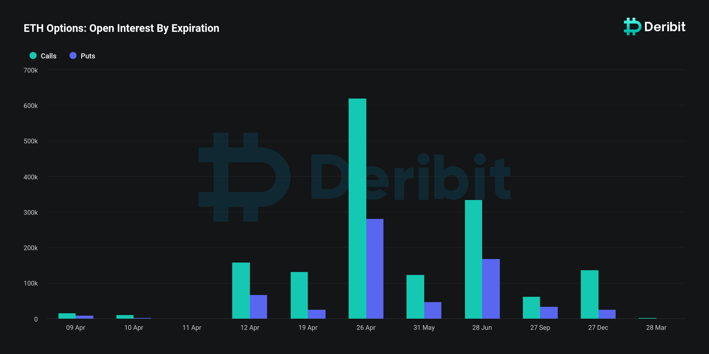 Approximately $3.3 billion in ether option contracts are set to expire on Deribit, with around two-thirds of that amount assigned to call options. Additionally, the Ethereum put-call ratio for April expiration is 0.45, suggesting a relatively more optimistic outlook compared to Bitcoin options.