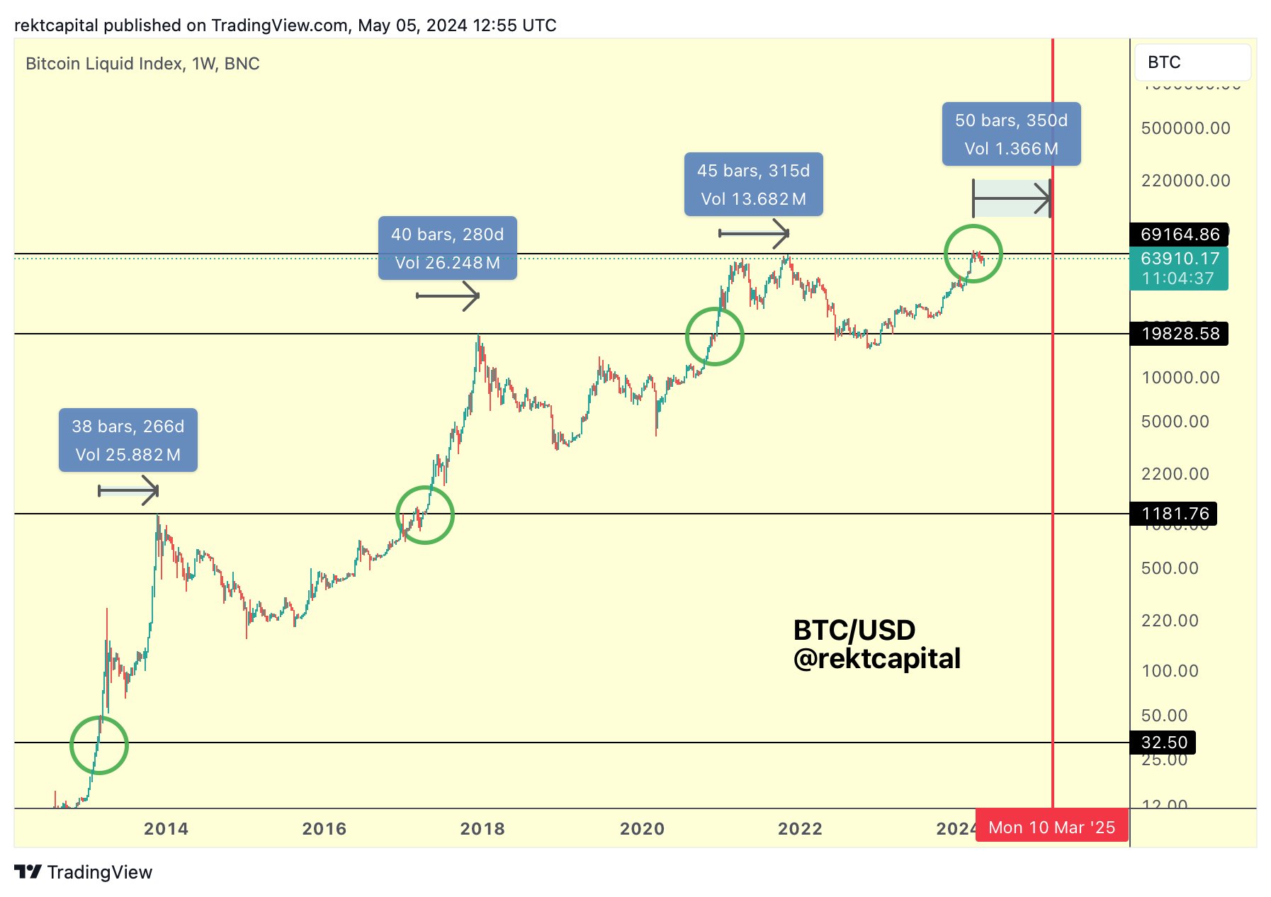 An analyst proposes changing the approach to forecasting Bitcoin price movements from solely focusing on cutting events in half to examining the timeframes following new all-time highs. Traditionally, Bitcoin’s price has peaked during a bull market around 266 to 315 days after surpassing previous peak levels. Since this benchmark was reached in mid-March 2024, it is estimated that the upcoming bull market top may occur between late November 2024 and late January 2025.