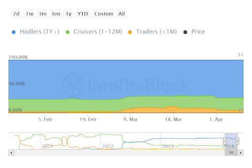 In the last week, on-chain information indicates that approximately 4% of SHIB‘s total circulating supply has been transferred from short-term holders to mid-term holders. Short-term holders typically sell their assets within a month, whereas mid-term holders keep their assets for longer periods, ranging from a month to a year. This shift has resulted in a decrease in the pressure on SHIB to be sold, contributing to its current trend.
