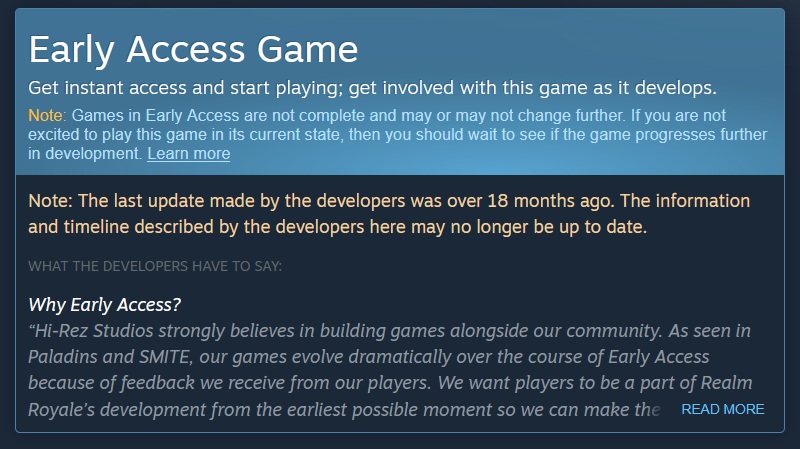 SteamDB’s social media platforms picked up on Steam’s recent updates regarding notifications for early access games that haven’t been updated in over a year. This new system appears to inform potential players or current owners about such games. For instance, on titles like Realm Royale Reforged, you might now see a message indicating the game has been inactive for over a year.