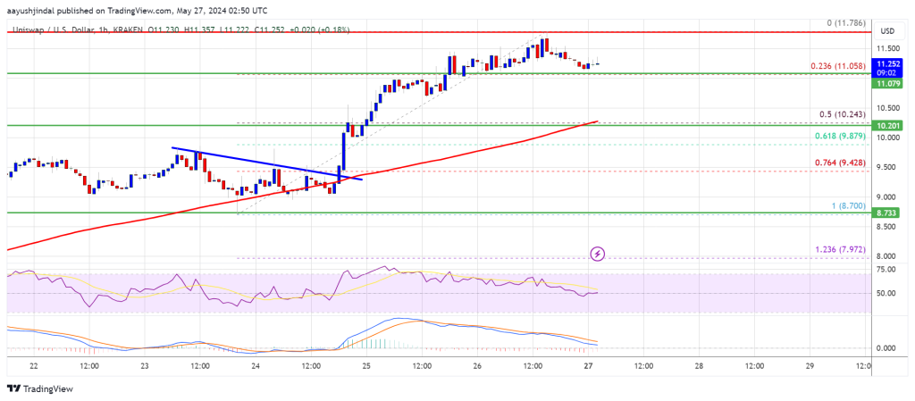 As a seasoned crypto investor with experience in the volatile market, I’ve seen Uniswap (UNI) make some impressive moves over the past few weeks. After forming a base above the $8.80 level, UNI started a fresh increase, following Bitcoin and Ethereum’s upward trends. The price gained momentum to break above resistance levels of $9.20, $9.50, and even $11.20.