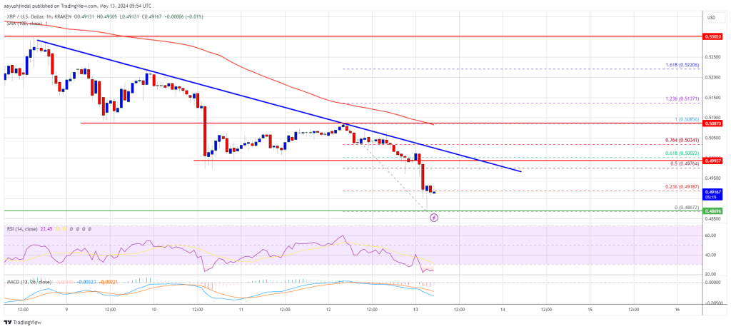 As a researcher with experience in cryptocurrency analysis, I’ve been closely monitoring the XRP market and its price action. Based on my observations, it appears that XRP has started a fresh decline below the $0.50 resistance zone. This decline could continue if the price closes below the $0.4865 support level.