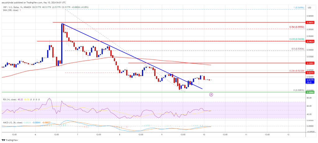 On the hourly XRP/USD chart, the resistance at $0.5120 was surpassed by a slight price rise. Additionally, there was a breach of a bearish trend line with resistance at $0.5150. However, the pair remains below both the $0.5250 mark and the 100-hour Simple Moving Average.