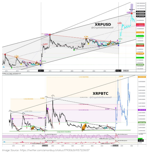 As an experienced analyst, I find Cryptobilbuwoo’s prediction on XRP intriguing, although it comes with its fair share of skepticism. Based on my life experience in the cryptocurrency market, I have seen how historical patterns and Fibonacci retracement levels can provide valuable insights into potential price movements. However, I also recognize that reaching a target as high as $589 would require an unprecedented increase in XRP’s value, which some may view as wishful thinking.